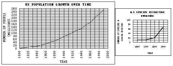 As is shown by the two graphs, during the period of time from 1800 to 1900, with the explosive growth of the U.S. population, the number of species no longer existing shot up, amounting to 70 in 1990. It is apparent that the population explosion resulted in the sharp decline in the wildlife of the country. What brought about this phenomenon?