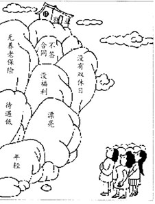 What is reveled in this picture is a prevalent phenomenon in contemporary society. Some employers set very high standards for their female employees who must be not only qualified in education, but also outstanding in personal appearance. Therefore, it is not strange to hear reports about female graduates from famous universities failing to find a job because of the prejudices and the high standard held by the employers.