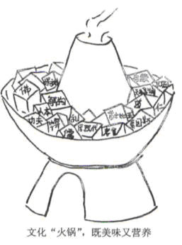 As is vividly depicted in the drawing, in the middle of the cartoon stands a hot pot, containing many Chinese cultural symbols, such as Beijing operas, Daoism, and some foreigh cultural symbols, etc. How impressive the drawing is in describing the common phenomenon that Chinese culture is becoming increasingly integrated into the world. The drawer’s intention seems to be highly self-evident and the meaning causes us to be thought-provoking。