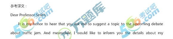 英语作文 本站小编 免费考研网 2018-12-28 Section Ⅳ Writing Part A 【题干】Directions: Suppose professor Smith ask you to plan a debate on the theme of city traffic, write an email to him 1)Suggest a topic and with your reasons; 2) And your arrangement You should write about 100 words on the ANSWER SHEET. Don&t use y ...