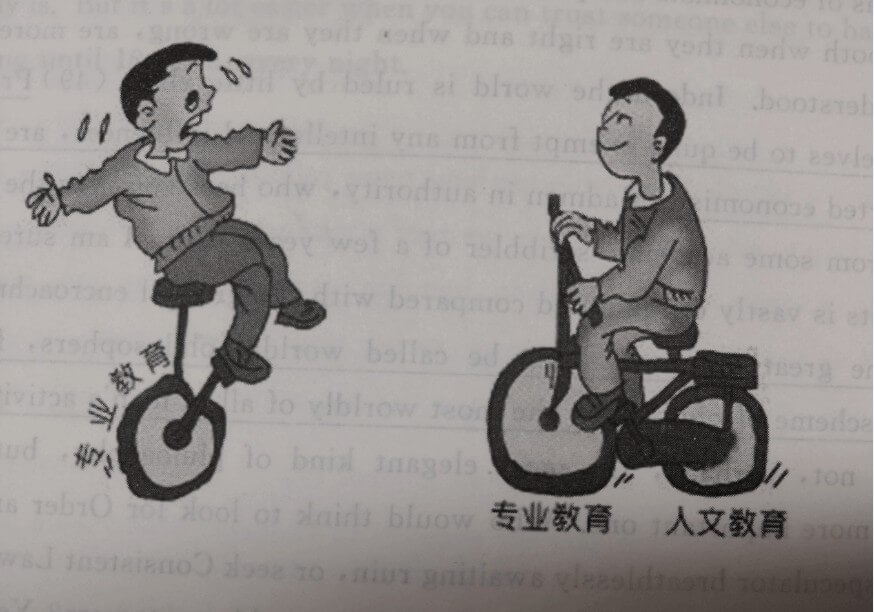 - 左图中,一个年轻人骑着代表“专业教育”的独轮车差点摔倒。相比之下,右图中的年轻人骑着前后轮分别代表“专业教育”和“人文教育”的自行车稳步前行。两幅图生动地表明只接受专业教育的人很难取得进步,平衡二者,才能顺利前进。