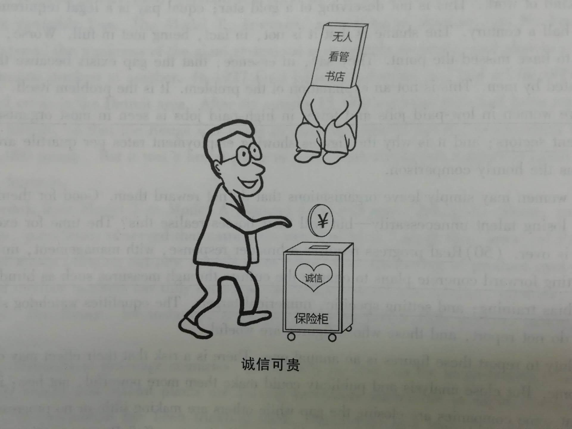 - In the picture above, in an unattended bookstore where there is no cashier(收银员) and no staff, a customer is paying for the book he has chosen of his own free will. Such a bookstore is basically based on the customers' integrity. This illustration reveals the importance of integrity in today's society.