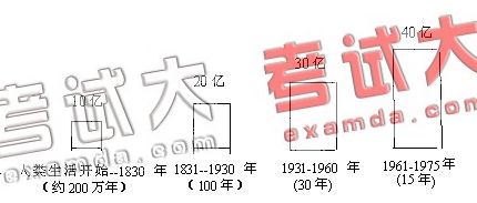 根据图中所给的数字, 从人类生活的初期到 1830年地球人口达到了10亿。 那表明至少有 200万年的时间间隔。后来世界人口迅速增长, 到 1930 年达到 20 亿。到 1960 年又增加了 10亿, 其间只有 30年时间, 从那时起, 全球人口一直在上升, 1975年总计为 40亿, 只有 15年又增加了 10亿。