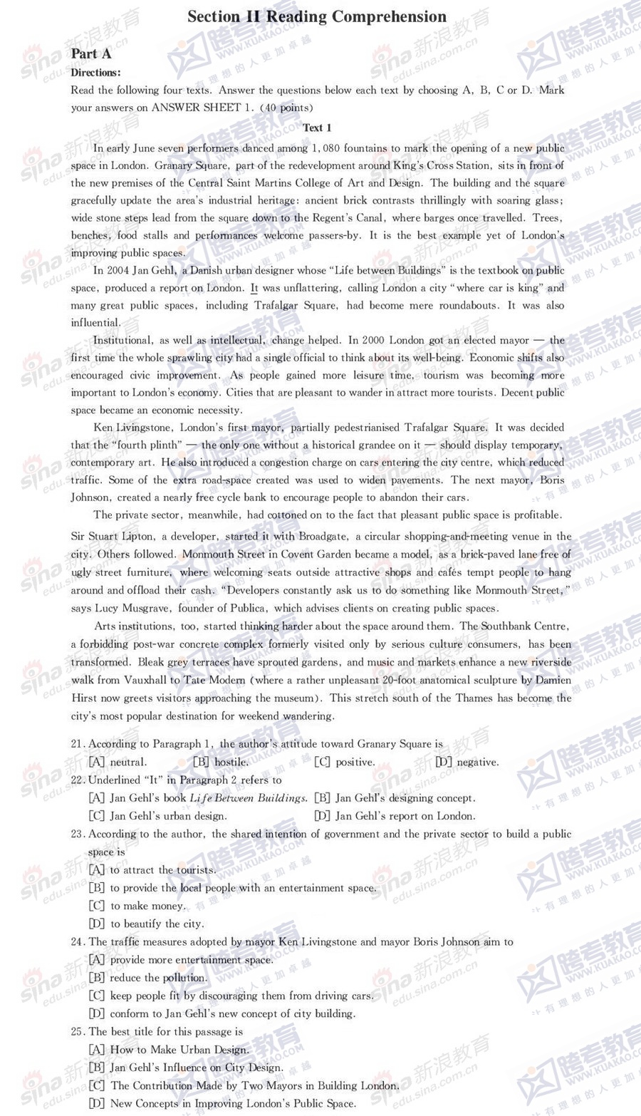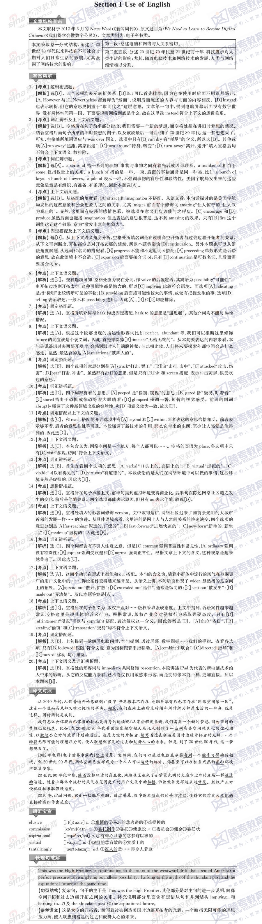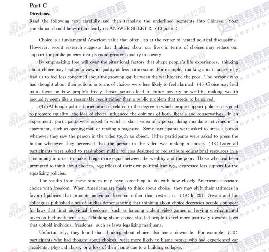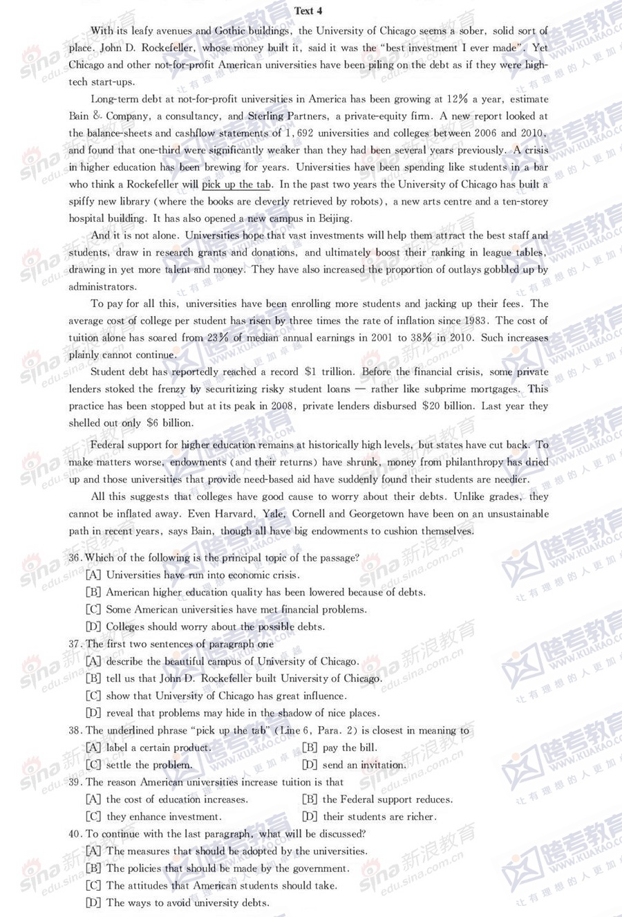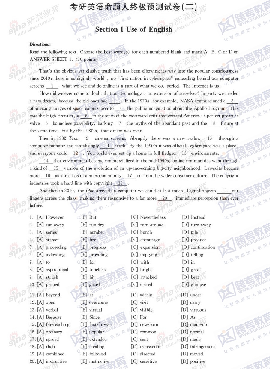 跨考教育2014年考研《英语一》模拟试题及参考答案(二)