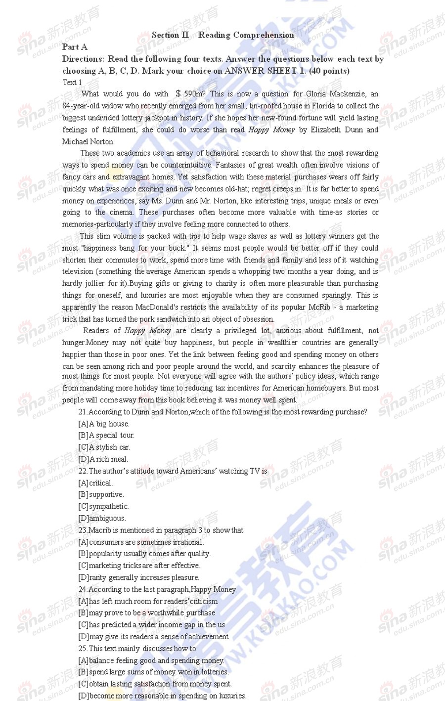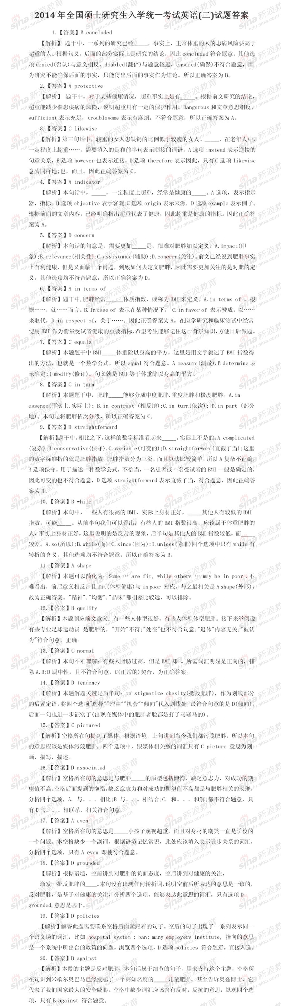 英语指导 新浪教育 免费考研网 2014-01-182012年全国硕士研究生入学统一考试英语(二)试题答案详解 Section I Use of English 1.【答案】B 【解析】从空后的句子“他们解放的人们”可以看出,空前的句子表示的应该是参加了第二次大战的男人和女人。只有serve有“服兵役”的意思,所以选B。其他都不符合题意。 2 ...