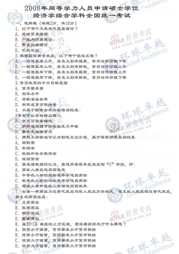 2008年同等学力人员申请硕士学位经济学综合学科全国统一试卷