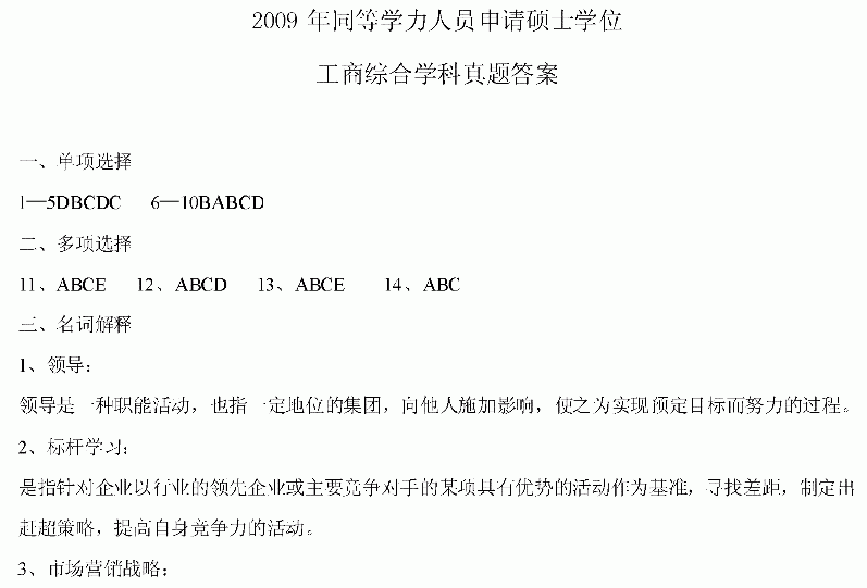 2009同等学力申硕考试工商综合真题及参考答案