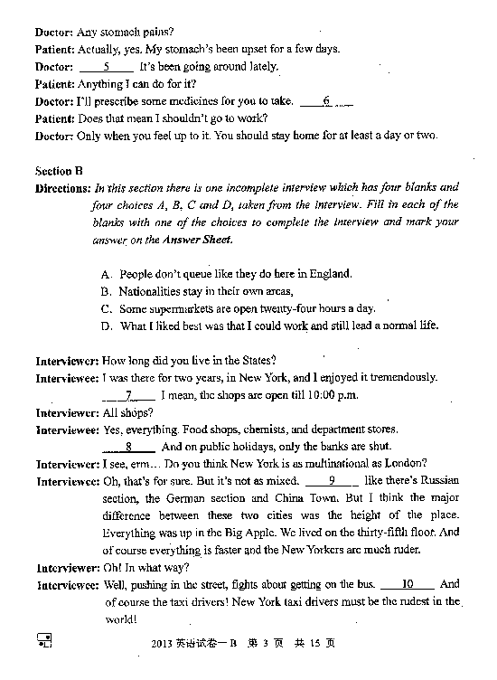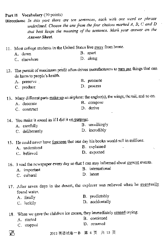 2013年同等学力申硕外国语水平全国统一考试已经结束,中国教育在线第一时间发布2013年同等学力申硕英语真题答案(A卷),供广大考生参考估分!  Part 1 Oral Communication (15 minutes 10 points)  (1) A. (2)C. (3) B.  (4) C. (5) B. (6) A.  (7)C (8)D (9) A (10) B  Part II Vocabulary (10 minutes, 10 poin ...