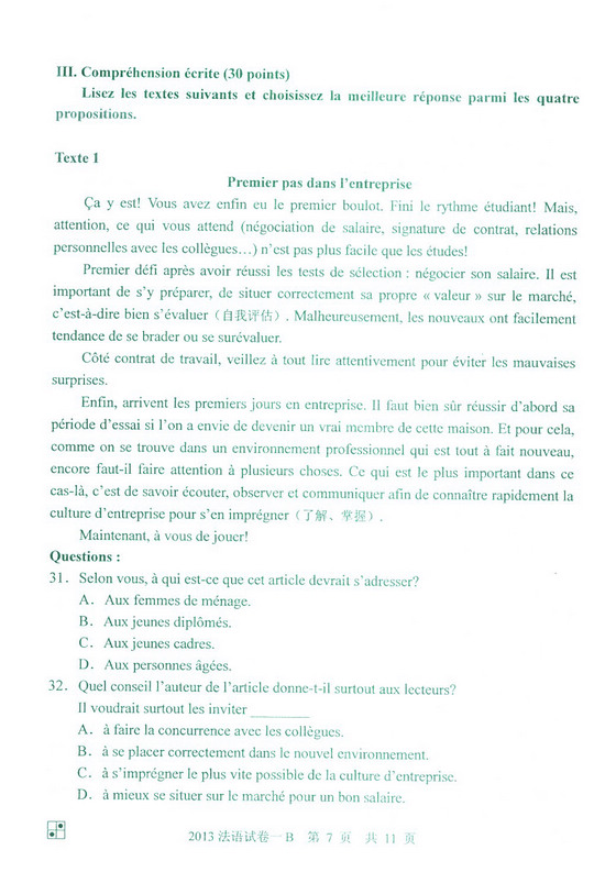 2013年同等学力申硕法语一卷(B卷)真题(3)