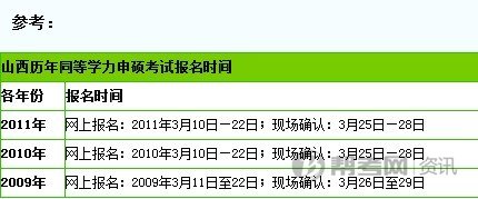 以下为山西省历年同等学力申硕考试报名时间,供大家参考。