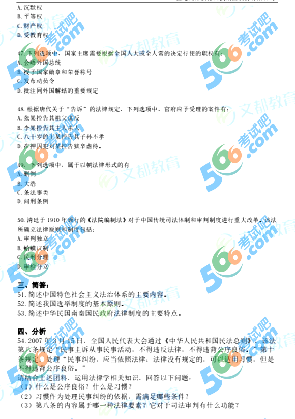 法律硕士招生 本站小编 辅仁网 2017-10-04一、命题思路预测: 与法学硕士相比,法律硕士考试主要针对的是非法学专业的考生,所以法硕考试考查的侧重点是法学基础知识,以主要的基础理论考查为主,与往年相比,非法学法硕题型今年有所变化,专业基础取消了辨析题,仍然保留法条分析。但并没有论述题。专业综合增加了一道论述题,专业基础的简答题由原来的6分变为1 ...