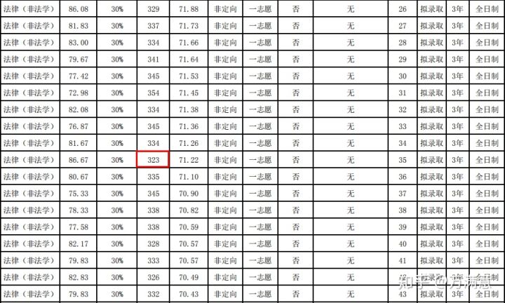 法硕(非法学)全日制进入复试人数为74人,拟录取人数为45人,刷29人,拟录取最高分为369分,拟录取最低分为323分,录取分数集中在330-349分,其中340-349分数段占17人。