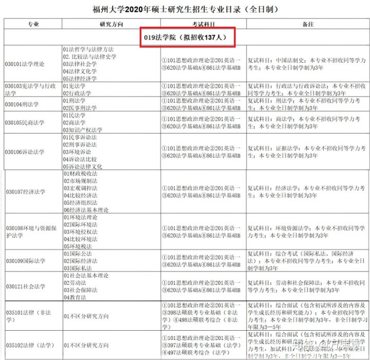(1)2020年福州大学法学院招生目录