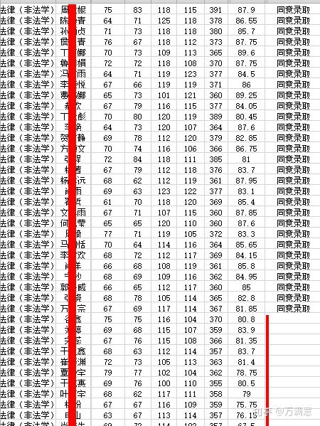 法硕(非法学)45人进入复试(含4名优秀营员),初试最低分为365(优秀营员除外),拟录取31人(含2免试优秀营员),录取最低分为365,365~370分数段有5人左右(不含优秀营员),刷14人,被刷最高分为381;