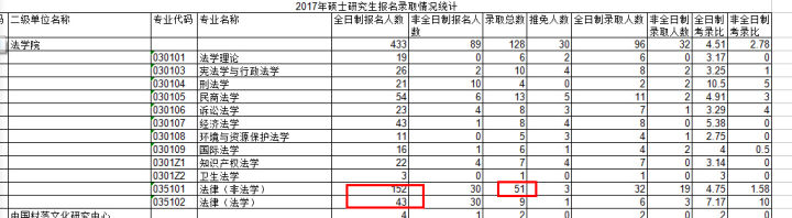 2017年中南大学报名录取情况, 法硕非法学 报名152,录取51人,法硕法学43人,录取9人