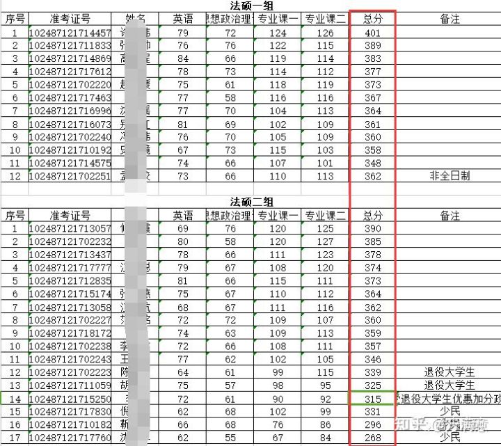 法硕(非法学)66人参加复试(含1少民3非全),最低分350分;法硕(法学)非全日制12人参加复试(含1退役),最低分315分