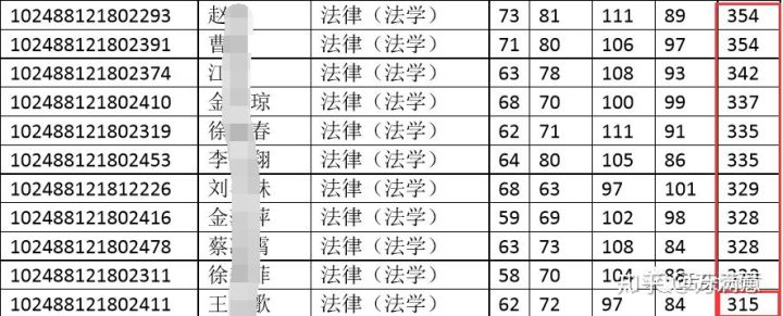 法硕(非法学)拟录取54人(含1少民),录取最低分350,刷9人,被刷最高分365;法硕(法学)非全日制拟录取11人,录取最低分315(含1退役)(如图8所示)