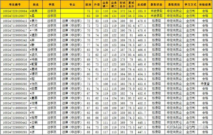法硕(非法学)进入复试为195人,录取91人,刷104人,录取最低分318,320左右的人仅几个而已,大部分都在340以上,被刷最高分368,大概有20多人未参加复试。