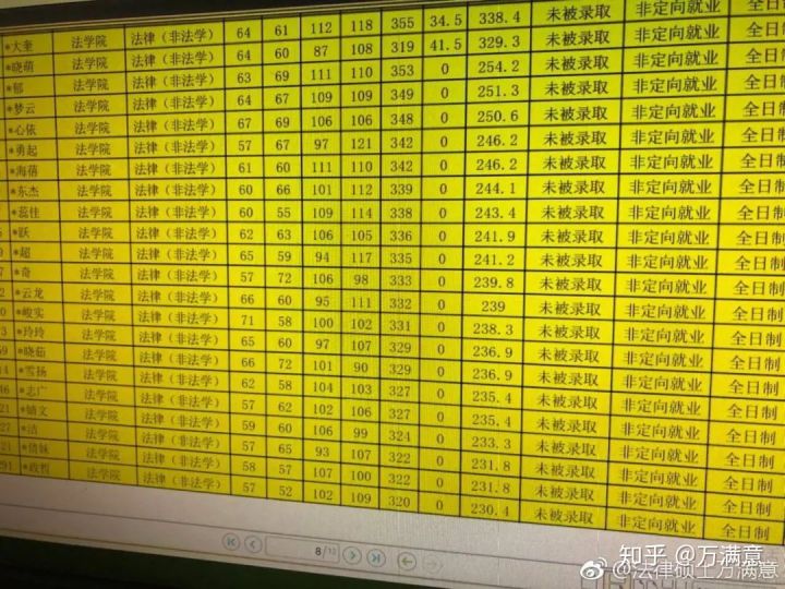 法硕(法学)进入复试57人,录取45人,刷12人,录取最低分328,被刷最高分338。(如图8所示)
