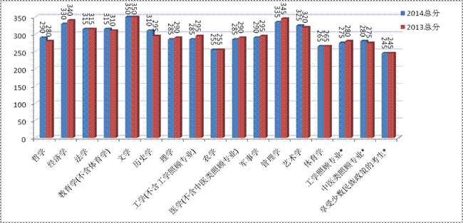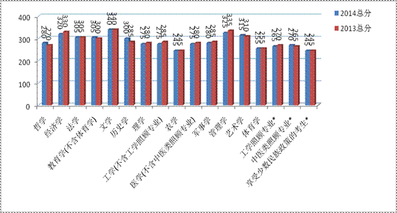 与2013年国家线相比,2014年学术型硕士A、B区国家线在哲学、教育学(不含体育学)、历史学、艺术学、中医类照顾专业等五个学科上有所上浮,其中历史学分数涨幅高达15分。经济学、管理学、理学、工学(不含工学照顾专业)、军事学、工学照顾专业、医学(不含中医类照顾专业)等七个学科的分数线有5到10分的下降,其中经济学与管理学分数降幅达到10分。法学、文学、农学、体育学、享受少数民族政策的考生的分数线保持不变。