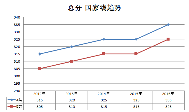 考研分数线 本站小编 福瑞考研网 2017-02-05体育复试国家线趋势走向 1、历年总分走向趋势 2、小科国家线一览表 小科(满分=100) A类 B类 2016年 34 31 2015年 34 31 2014年 ...