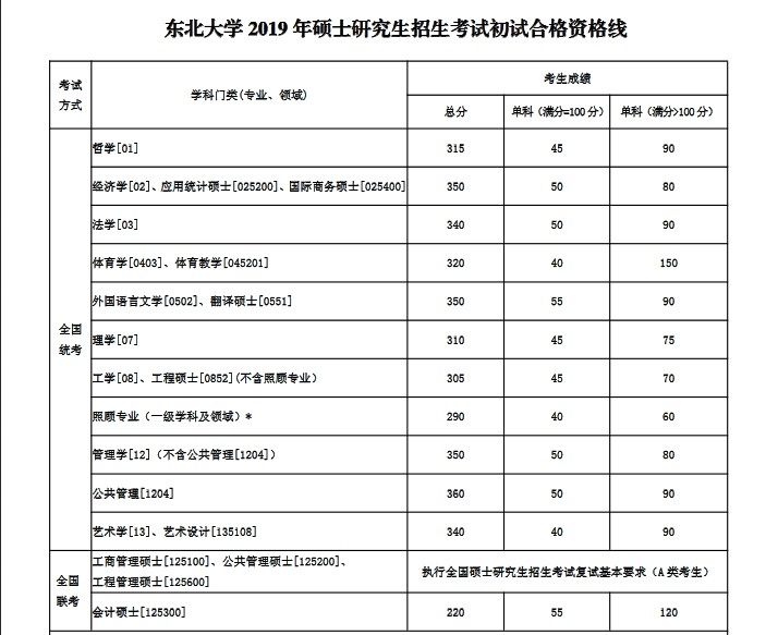 据东北大学研究生院消息,2019年东北大学考研复试分数线已出,详情如下: