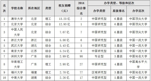 2014中国大学校友捐赠排行榜100强揭晓,清华校友豪捐13亿排名第一