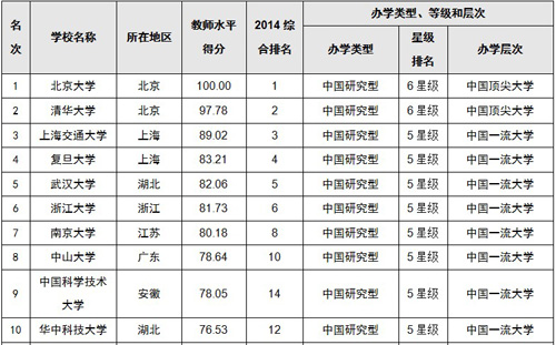 报告显示,在中国校友会网最新发布的2014中国大学教师水平排名中,北京大学教师表现最佳,得分最高,教师教学和学术水平最高,高居2014中国大学教师水平排行榜100强榜首;清华大学97.78分,位居第二;上海交通大学89.02分,名列第三;复旦大学83.21分,居第四;武汉大学82.06分,列第五;浙江大学81.73分,居第六;南京大学80.18分,列第七,中山大学78.64分,居第八,中国科学技术大学78.05分,列第九,华中科技大学76.53分,位居第十。