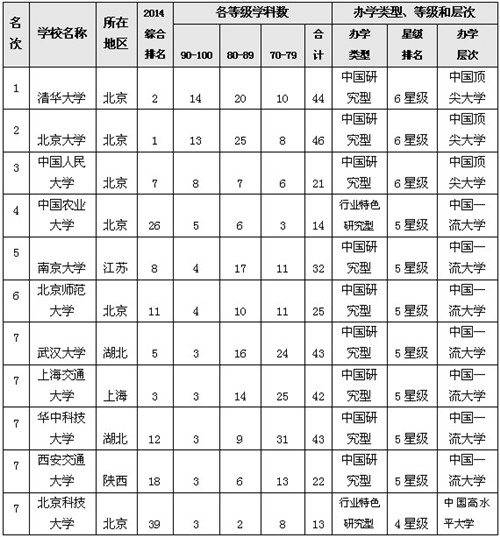 为客观反映全国高校的学科水平和学科实力,中国校友会网依据教育部学位与研究生教育发展中心2012年全国学科评估结果,首次发布2014中国大学学科水平排行榜。在参与学科评估的全国高校中,评估得分在90分以上的一级学科有110多个,其中,清华大学学科评估结果表现最佳,有14个学科评估得分在90分以上,高居2014中国大学学科水平排行榜100强榜首;北京大学有13个学科评估得分超过90分,居全国第二;中国人民大学有8个,名列第三;中国农业大学有5个,居第四;南京大学和北京师范大学各有4个,并列第五;武汉大学、上海交通大学、华中科技大学、西安交通大学和北京科技大学等各有3个一级学科评估得分超过90分,并列全国大学第七名。