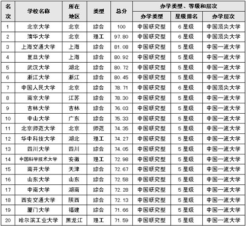 报告显示,在中国校友会网最新公布的2014中国大学排行榜100强中,北京大学连续7年蝉联第一,问鼎2014中国大学排行榜榜首;清华大学位居第二;上海交通大学跃居第三,比去年上升2个名次;复旦大学下降一个位次,屈居第四,武汉大学排名第五,首次进入全国五强;浙江大学下降两位,位居第六;中国人民大学升至第七,比去年上升5个位次;南京大学下降2个名次,名列第八;吉林大学位居第九;中山大学列第十。