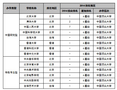 2014年3月26日,中国校友会网最新编制完成《2014中国大学评价研究报告》,报告显示,在最新发布的2014中国两岸四地大学星级排名中,中国大陆有北京大学、清华大学、中国科学院大学和中国人民大学等荣膺2014中国六星级大学;台湾大学、香港大学、香港中文大学和香港科技大学等港澳台院校荣膺2014中国六星级大学,跻身2014中国顶尖大学队列。中央音乐学院、中央美术学院、北京体育大学、中央戏剧学院、北京电影学院和台湾艺术大学等两岸四地特色专业型大学荣膺2014中国六星级大学美誉,跻身2014中国顶尖大学队列。