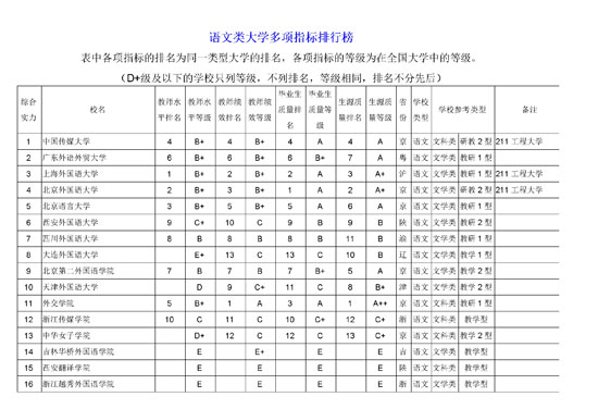 在下表的教师水平、教师绩效、毕业生质量、新生质量对照排行榜中,凡等级在C级及以上的,列出排名和等级,D+级及以下的只列等级,不列排名,等级相同,排名不分先后。其中的毕业生质量得分,是新生质量排名和教师水平排名相加之和,毕业生质量得分相同的,按教师水平排名排列。