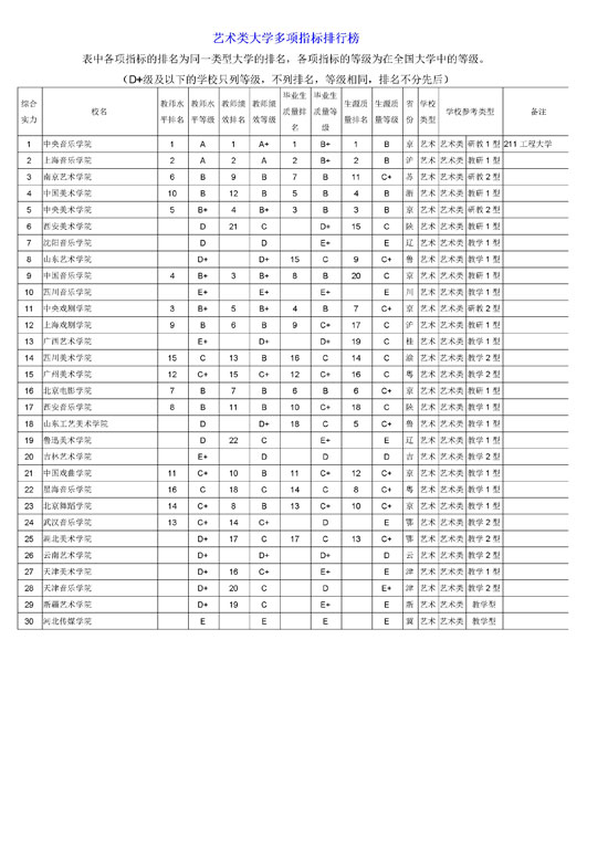 在下表的教师水平、教师绩效、毕业生质量、新生质量对照排行榜中,凡等级在C级及以上的,列出排名和等级,D+级及以下的只列等级,不列排名,等级相同,排名不分先后。其中的毕业生质量得分,是新生质量排名和教师水平排名相加之和,毕业生质量得分相同的,按教师水平排名排列。