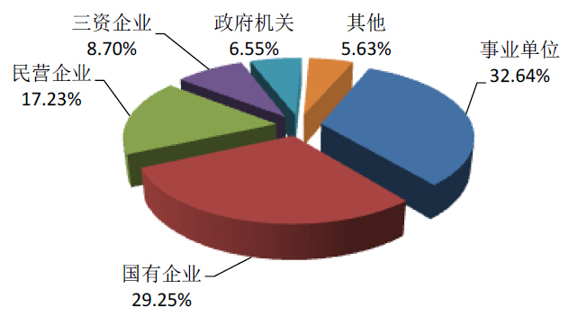 南开大学2014届研究生的就业单位性质分布如下图所示:主要集中于事业单位,占比32.64%;其次是国有企业和民营企业,占比分别为29.25% 和17.23%。