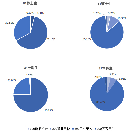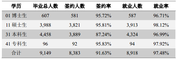 截止 2014 年 12 月 31 日,该校 2014 届毕业生就业人数达到 8918 人,整体就业率达到 97.48%,整体签约率达到 91.63%。各学历就业率/签约率情况表1所示,其中博士生就业率达到 96.71%,硕士生就业率 98.12%,本科生就业率96.99%,专科生就业率 97.92%。