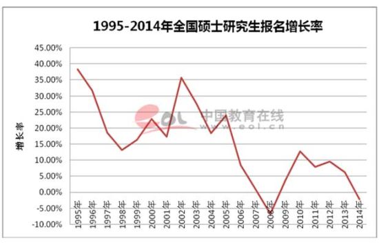 从上图可以看出,近20年来,全国硕士研究生招生报名增长率在2008年、2014年分别出现负增长。