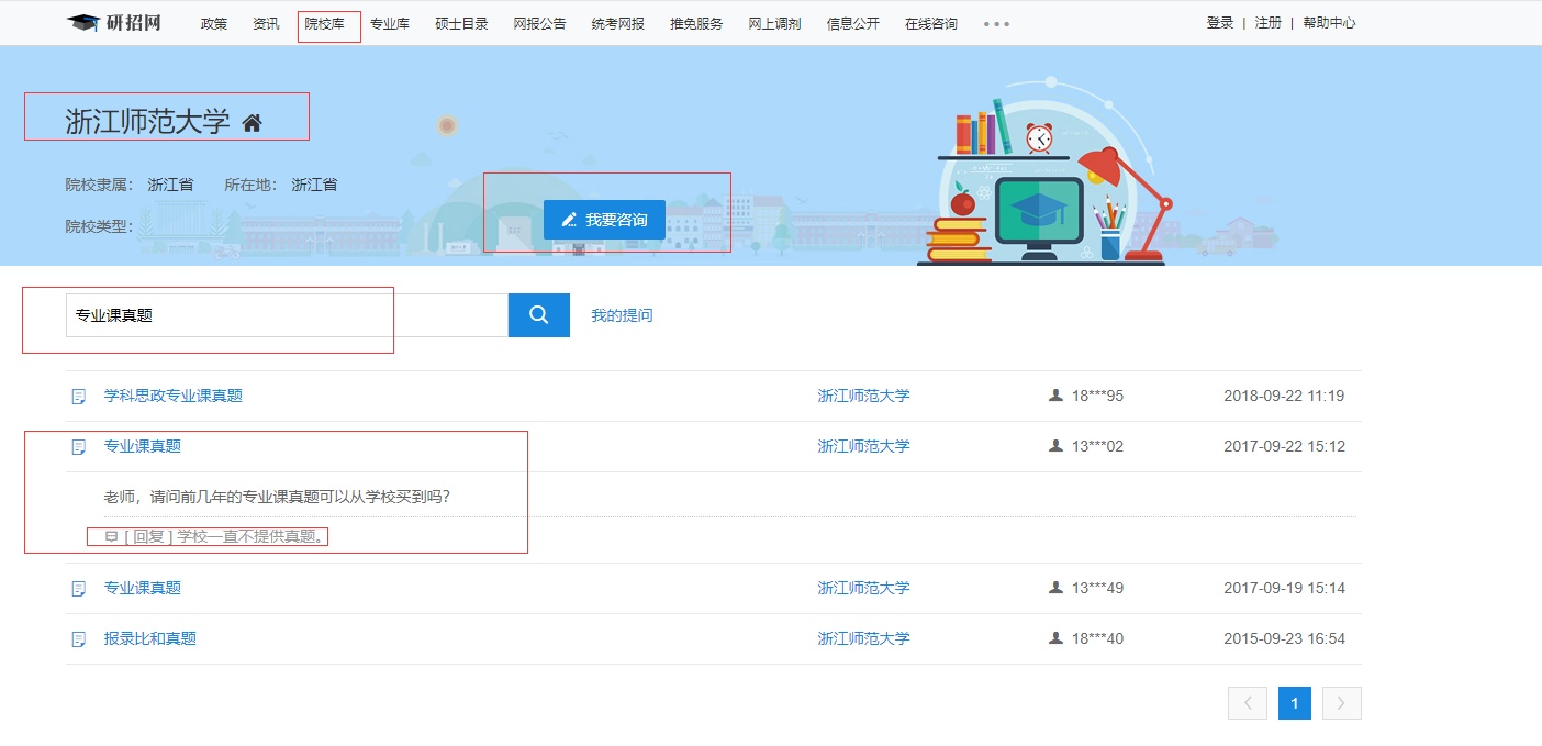 查找方式:“院校库”→输入“目标院校”→“我要咨询”→“考研真题”