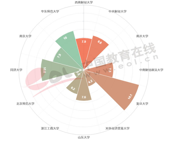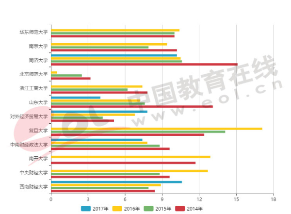 从图2可以看出,2014-2017年金融学硕士研究生报录比最高值是2016年复旦大学,达到17.1:1,其次是2014年同济大学15.1:1。而这两所学校近三年报录比则呈现完全相反的趋势,复旦大学2014年至2016年报录比逐渐走高,同济大学自2015年明显下降后基本呈现稳定走势。
