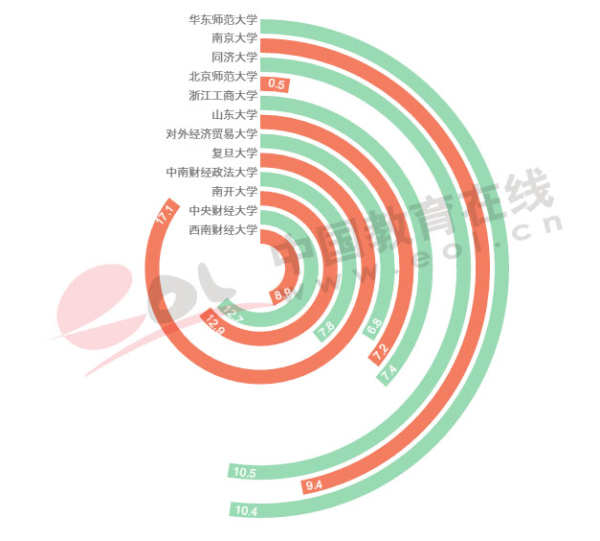 值得注意的是,在《2016-2017中国研究生教育及学科专业评价报告》“金融学专业竞争力排行榜”中,西南财经大学、中央财经大学、南开大学、中南财经政法大学、复旦大学、对外经济贸易大学均是等级“5星”的高校,但是西南财经大学和对外经济贸易大学近年来金融学报录比在同等级学校中却较为靠后。