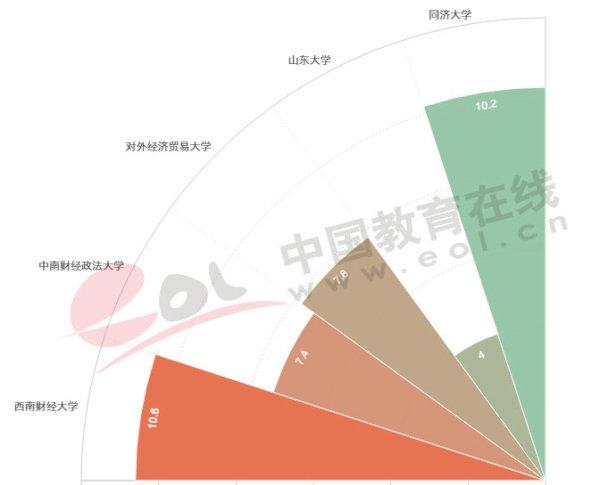 2017年大部分高校还未公布分专业报录比,但是从收集的5所高校的报考和录取数据来看,西南财经大学金融学专业2017年报录比为10.5:1,达到近三年最高值。山东大学金融学专业2017年报录比为4:1,达到近三年最低值。(参考图2)