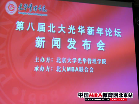 此次新闻发布会的主题是第八届北大光华新年论坛"自主创新与可持续发展"相关信息发布,新闻发布会由北京大学光华管理学院国际合作与公共关系部主任王亚非老师主持,到场嘉宾有北京大学光华管理学院副院长张维迎教授和北京大学MBA联合会主席马斌同学。在新闻发布会上,张维迎教授、王亚非主任和马斌主席分别详细介绍了新年酒会论坛主题论坛、各分论坛、酒会的准备情况以及联合会、分工准备新年论坛情况。北京大学光华管理学院上上下下对此次论坛是极为重视的,从论坛规模到嘉宾阵容在国内都是首屈一指的,而且张维迎副院长一直在强调一个词--品牌,足以证明,本次论坛绝对值得我们期待!