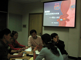 从互动的游戏中,学员们迅速进入组织者的角色。在孟老师引导下,第一团队与第二团队利用短短的十五分钟时间选举出各自团队的队长与副队长,并为自己的团队设计团队名称、活动标志和活动口号,最后初拟了各自所负责项目的大体框架。