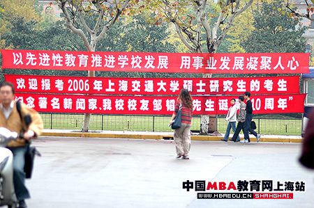 交大校园里悬挂横幅欢迎前来报考的考生