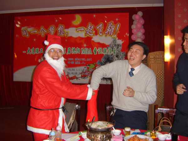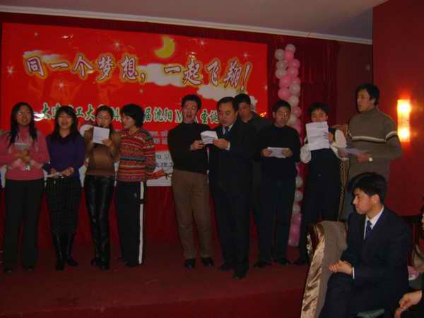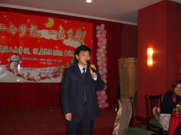 "Time is passing away. When we throw the stone of memory into the river, time spark will flash in our mind. At the time of 2005 Christmas coming, old scene of past year is still floating in front of our eyes. 岁月悄悄的流淌,投下回忆的石子,时间的痕迹就会飞溅在眼前。在2005圣诞到来之际,去岁的情景却仿佛还在眼前。"在赫永峰,马丽佳中英文主持下,刘彦文老师宣读了大工领导对沈阳MBA教学基地本次活动的贺词,晚会在04级班长宋春喜的新年祝词中拉开了序幕。