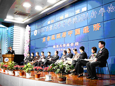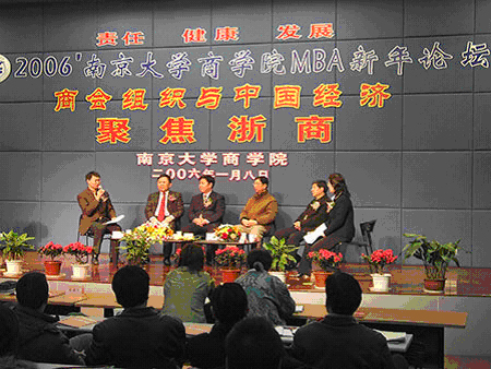2006年1月7日---8日,南京大学在逸夫管理楼20楼多功能报告厅举办了南京大学商学院MBA新年论坛。此次论坛的主题是商会组织与中国经济。7日上午9:00-10:00为开幕式暨《南京大学MBA论坛丛书(第一辑)》发布会,由南京大学商学院MBA教育中心主任韩顺平博士主持,参加开幕式的有全国政协委员、中国民(私)营经济研究会会长保育钧、南京大学党委书记洪银兴、南京大学常务副校长施建军、南京大学党委组织部部长杨忠、江苏省进出口商会副会长、中设江苏机械设备进出口集团公司总裁余本礼等众多知名企业家和南京大学商学院的多名教授。