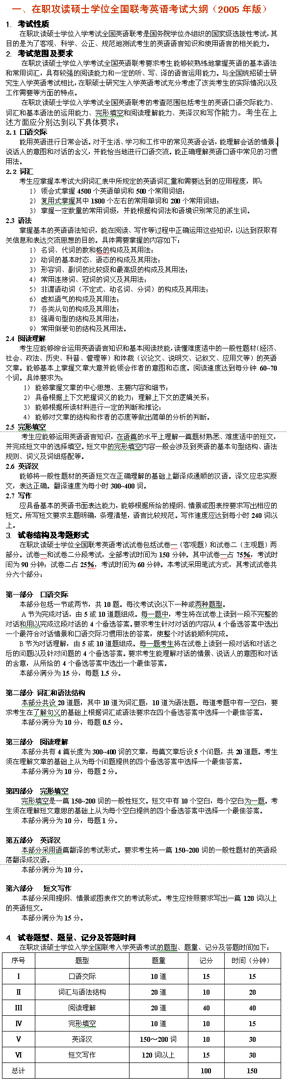 在职攻读硕士学位全国联考英语考试大纲(2005年版)