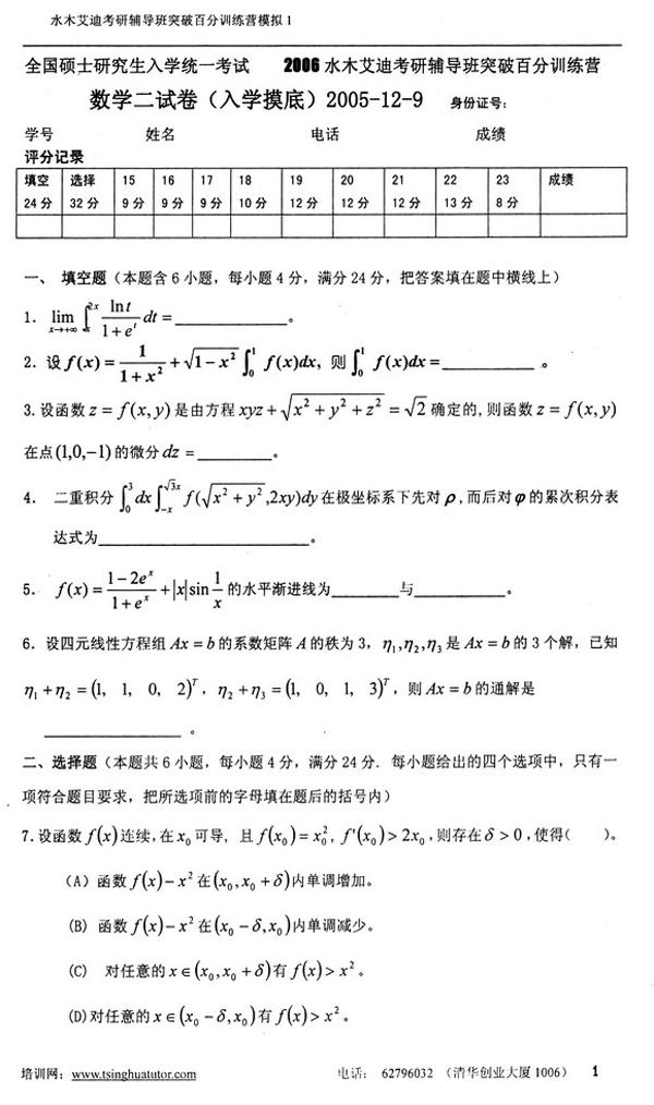 在经过一段时间的努力复习后,进入最后复习冲刺阶段,参与“制胜考研数学的三十六技”的学习之前,检验一下自己的复习程度。