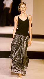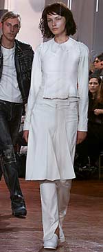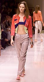 Fashion in the year 2000 is a far from the silver spacesuits and goggles [1] envisioned by our predecessors in the '50s and '60s. In fact, the first collection of the new millennium [2] feels a lot like, well, 1980. The discreet charm of the hip new bourgeoisie showed in sleek, slim pants, sharply cut blazers and open men's shirts. But a more playful side of the '80s was also reinterpreted-"Girls just want to have fun" was the most popular soundtrack on the runways.