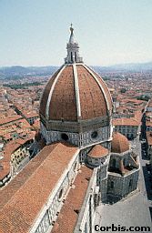Not far from the Palazzo Vecchio lies Florence's Cathedral Square. The beautiful domed Duomo, or "House of God," took nearly 150 years to build (1294-1436). One of the most famous engineers of the day designed it. Visitors still marvel at the dome, the crowning feature of the cathedral. To this day, no building in Florence may rise above the dome. 离维琪奥宫不远的地方座落着翡冷翠教堂广场。华丽圆顶的翡冷翠教堂,或称「神的殿堂」,花了将近150年才建造完工(1294-1436),并由当时最著名的工程师设计而成。今日的游客仍惊叹于这个圆顶,它是教堂中最引人注目像皇冠似的一景。时至今日,在佛罗伦萨没有任何一栋建筑高过这个圆顶的。