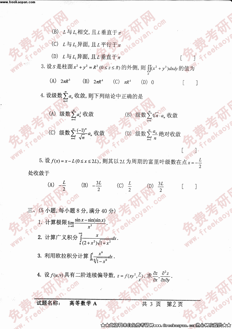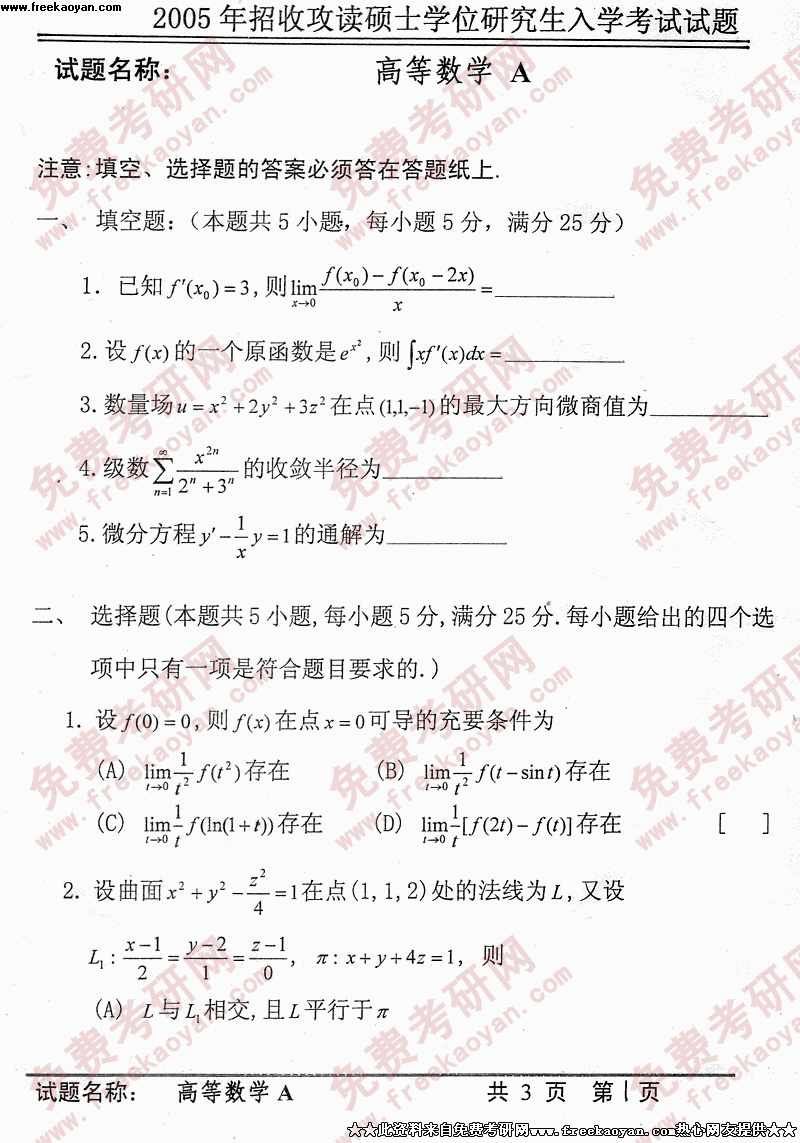 中国科学技术大学2005年硕士研究生入学考试高等数学